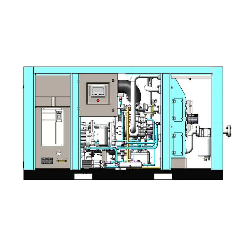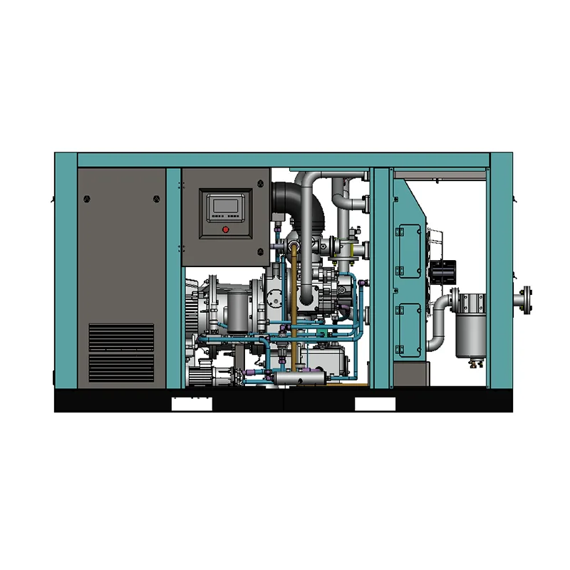 يستخدم ضاغط الهواء اللولبي الجاف الخالي من الزيت من شركة Yuzhen جسم الضاغط اللولبي الخالي من الزيت الذي طورته شركة Hanbell - وهو مزيج من رؤوس الضاغط المزدوجة ذات الضغط المنخفض والضغط العالي، والتي تعتمد على الدوار للتشابك مع الهواء المضغوط، بدون ملامسة الزيت طوال العملية؛ يتم أيضًا معالجة الدوار والجسم بطبقة خاصة متينة ومقاومة للتآكل. يمكنه تحقيق جودة هواء من الفئة 0 TUV (أعلى معايير النظافة الدولية)، مع عدم وجود رذاذ زيتي أو شوائب في الهواء المضغوط.