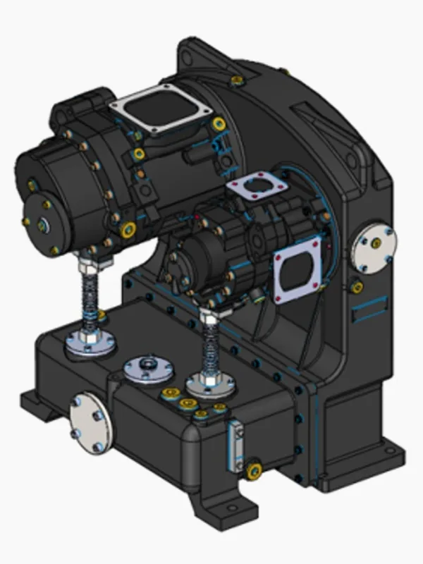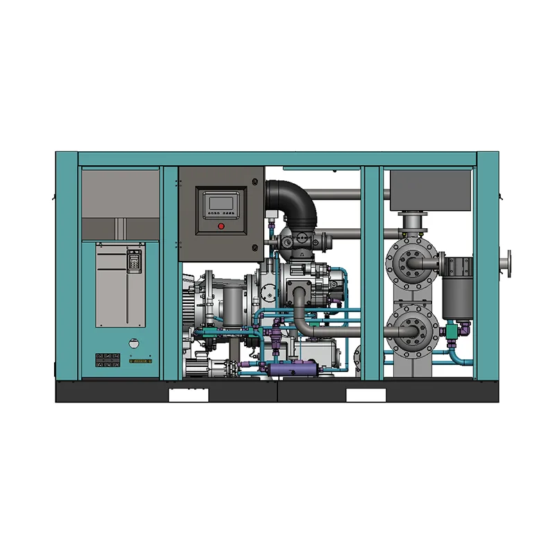 تبلغ نسبة التروس لرأس الضاغط منخفض الضغط 3 أسنان للدوار الدافع و4 أسنان للدوار المدفوع؛ يستخدم رأس ضاغط مرحلة الضغط العالي 4 أسنان للدوار الدافع و6 أسنان للدوار المدفوع. تخضع جميع الدوارات لمعالجة سطحية خاصة. على وجه الخصوص، تستخدم مرحلة الضغط العالي دوارات من الفولاذ المقاوم للصدأ، وهي متينة - قادرة على تحمل درجات الحرارة والضغوط العالية - ولها هيكل فريد، مما يجعل من السهل مطابقتها لمواصفات مختلفة، مع سهولة التشغيل والصيانة؛ يضمن تصميم ختم العمود الفريد وجود هواء مضغوط خالٍ من الزيت تمامًا.